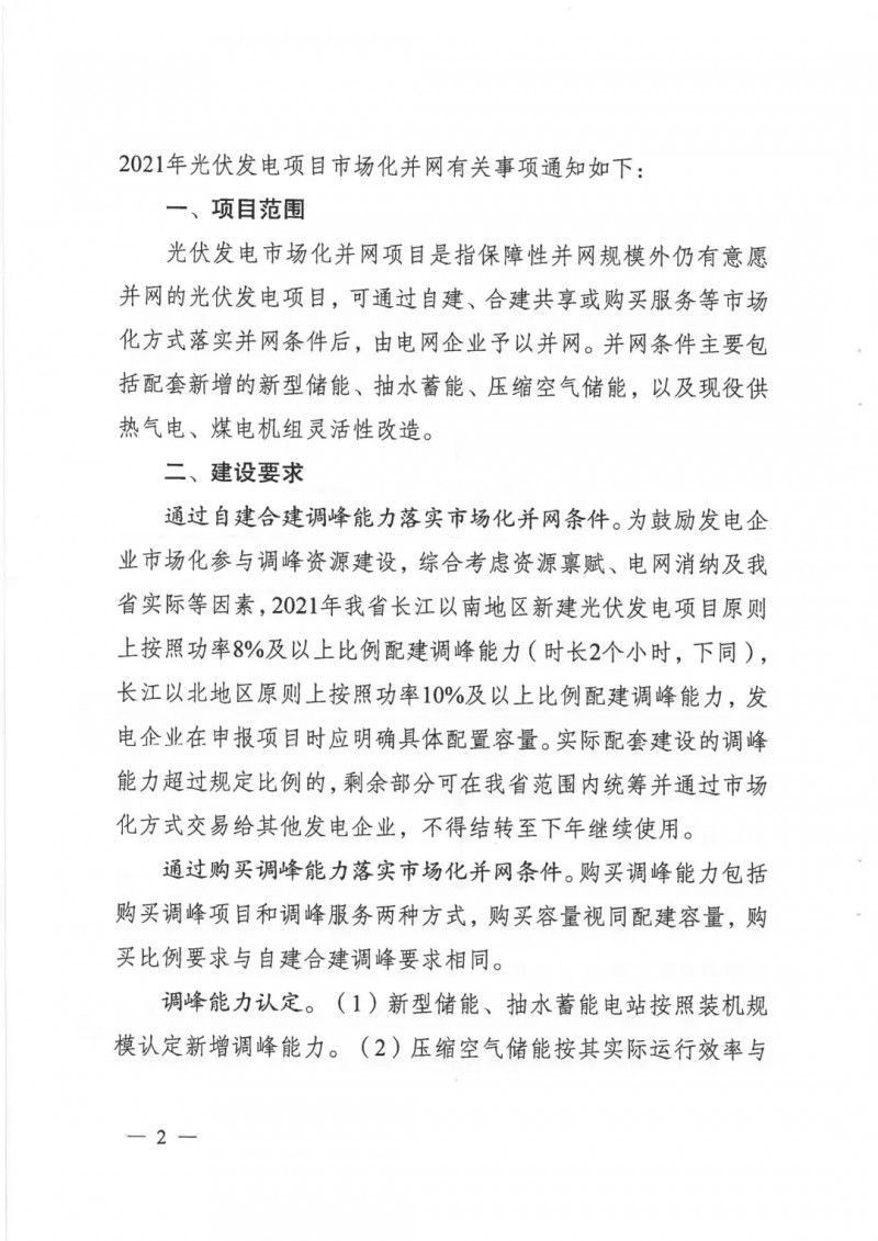 根據(jù)文件,2021年江蘇省長江以南地區(qū)新建光伏發(fā)電項目原則上按照功率8%及以上比例配建調(diào)峰能力(時長2小時,下同),長江以北地區(qū)原則上按照功率10%及以上比例配建調(diào)峰能力;調(diào)峰能力超過規(guī)定比例的,剩余部分可在江蘇省范圍內(nèi)統(tǒng)籌并通過市場化方式交易給其他發(fā)電企業(yè)。