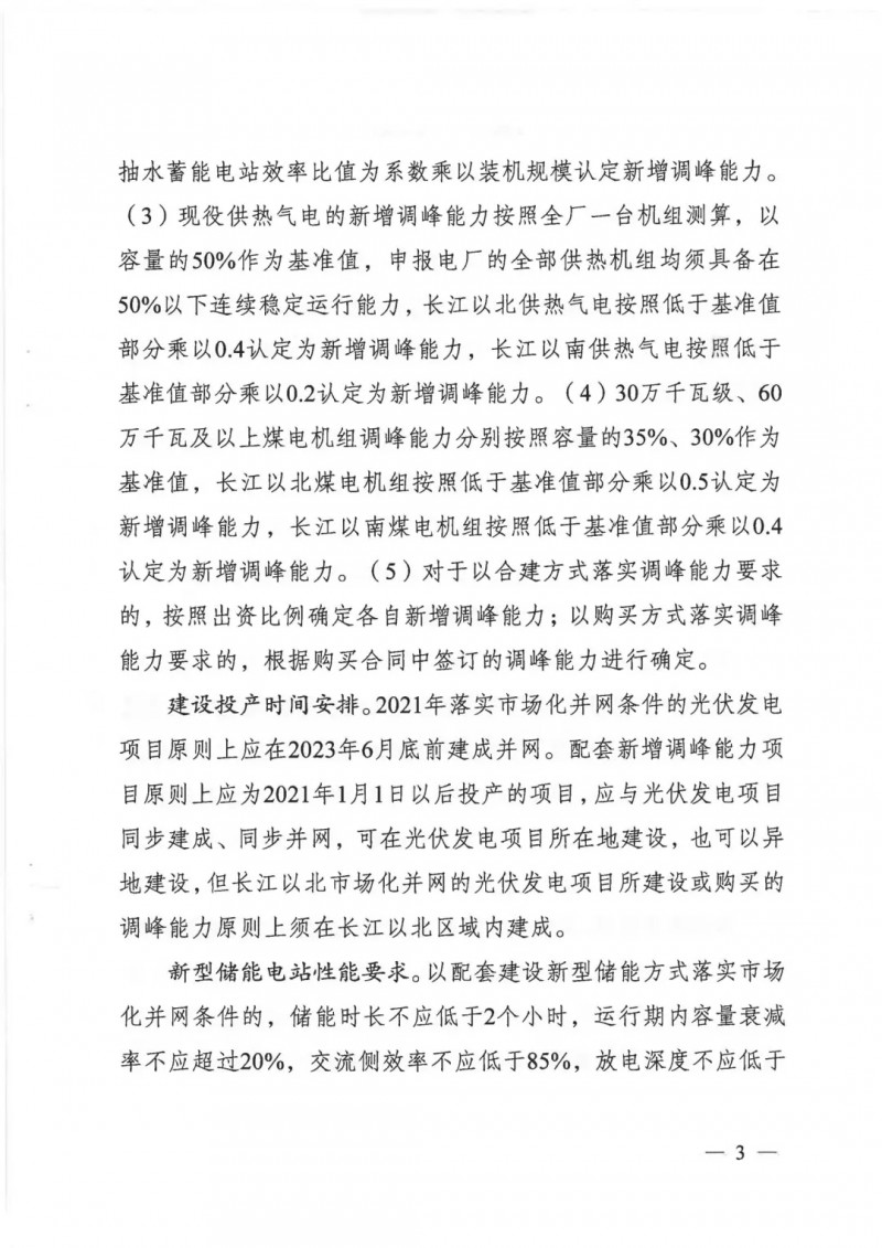 關(guān)于調(diào)峰能力認(rèn)定方面,文件明確,新型儲能、抽水蓄能按裝機(jī)規(guī)模認(rèn)定;壓縮空氣儲能按其實際運行效率與抽水蓄能電站效率比值為系數(shù)進(jìn)行認(rèn)定;現(xiàn)役供熱氣電的新增調(diào)峰能力按照全廠一臺機(jī)組測算,以容量的50%作為基準(zhǔn)值,申報電廠的全部供熱機(jī)組均須具備在50%以下連續(xù)穩(wěn)定運行能力,長江以北、以南分別按照低于基準(zhǔn)值部分乘以0.4、0.2認(rèn)定為調(diào)峰能力;30萬千瓦級、60萬千瓦及以上煤電機(jī)組調(diào)峰能力分別按照容量的35%、30%作為基準(zhǔn)值,長江以北、以南分別按照低于基準(zhǔn)部分乘以0.5、0.4認(rèn)為定新增調(diào)峰能力。