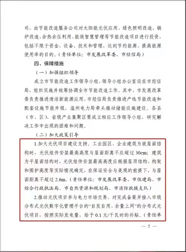 近日浙江溫州市和平湖市相繼公示了分布式補(bǔ)貼標(biāo)準(zhǔn)。10月25日,溫州市人民政府辦公室關(guān)于印發(fā)溫州市制造業(yè)千企節(jié)能改造行動(dòng)方案(2021-2023)的通知。其中要求加大光伏項(xiàng)目建設(shè)支持。工業(yè)園區(qū)、企業(yè)建筑為坡屋面結(jié)構(gòu)時(shí),光伏組件安裝最高高度與屋面距離不應(yīng)超過(guò)30cm;建筑為平屋面結(jié)構(gòu)時(shí),光伏組件安裝最高高度應(yīng)根據(jù)屋頂結(jié)構(gòu)、構(gòu)架和圍護(hù)高度等實(shí)際情況確定,在保證安全與美觀的前提下,與屋面距離不超過(guò)2.6m。