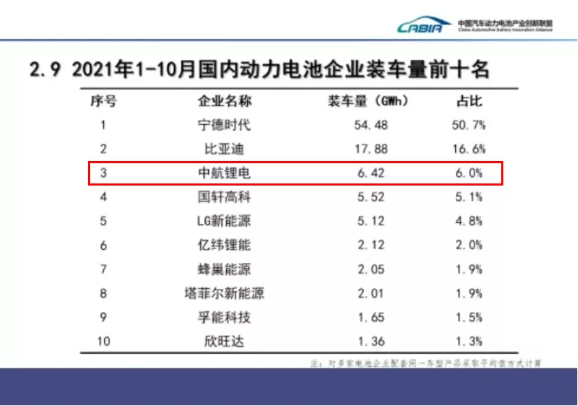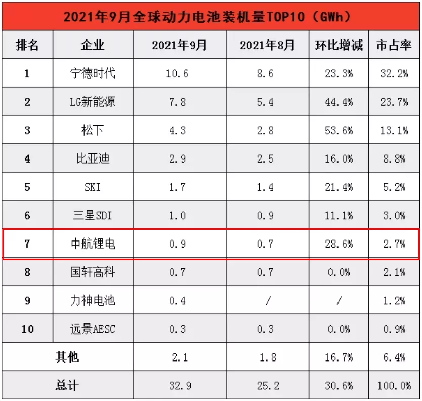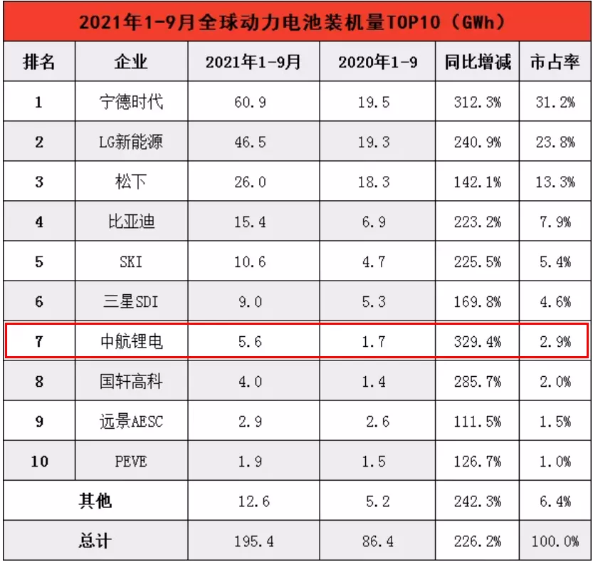 在10月底韓國(guó)市場(chǎng)研究機(jī)構(gòu)SNE Research公布的2021年1-9月全球動(dòng)力電池裝車量排行榜中,中航鋰電以5.6GWh的動(dòng)力電池裝車量,位居第七。