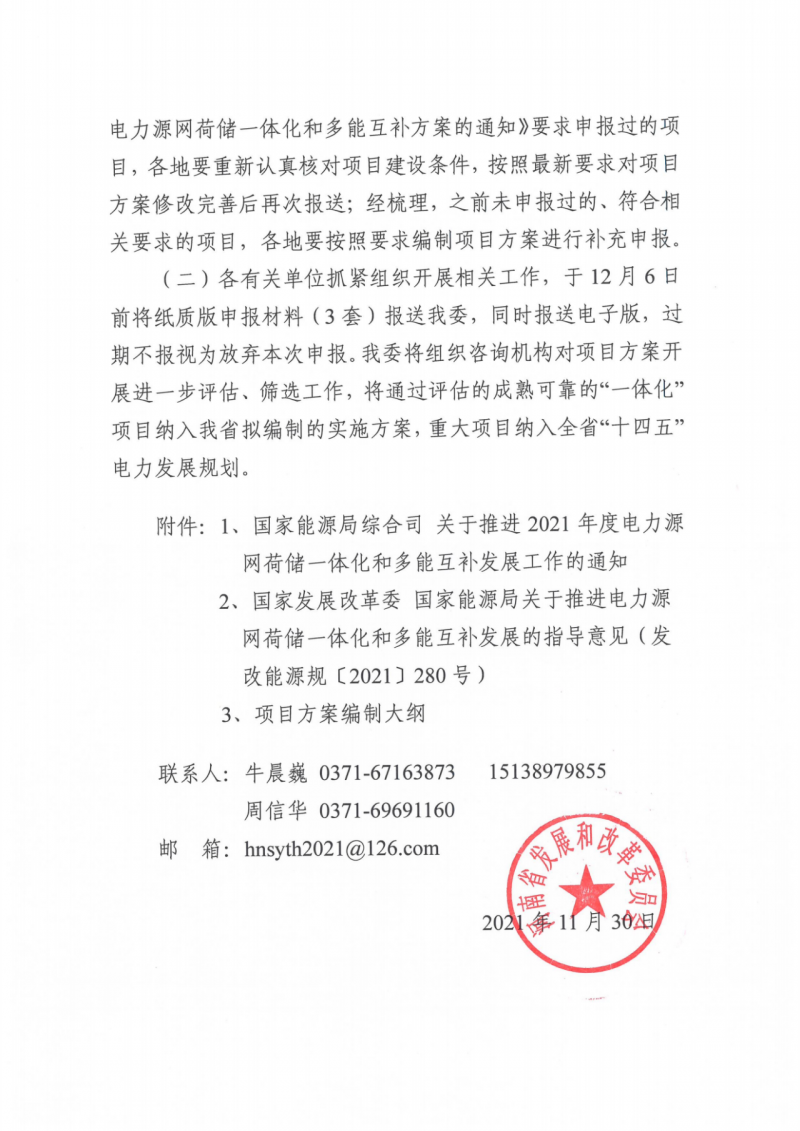 11月30日,河南省發(fā)改委發(fā)布了《關(guān)于補(bǔ)充申報(bào)“十四五”電力源網(wǎng)荷儲一體化和多能互補(bǔ)項(xiàng)目方案》的通知。在今年上半年河南發(fā)改委組織申報(bào)項(xiàng)目的基礎(chǔ)上,再次補(bǔ)充申報(bào)“一體化”項(xiàng)目。