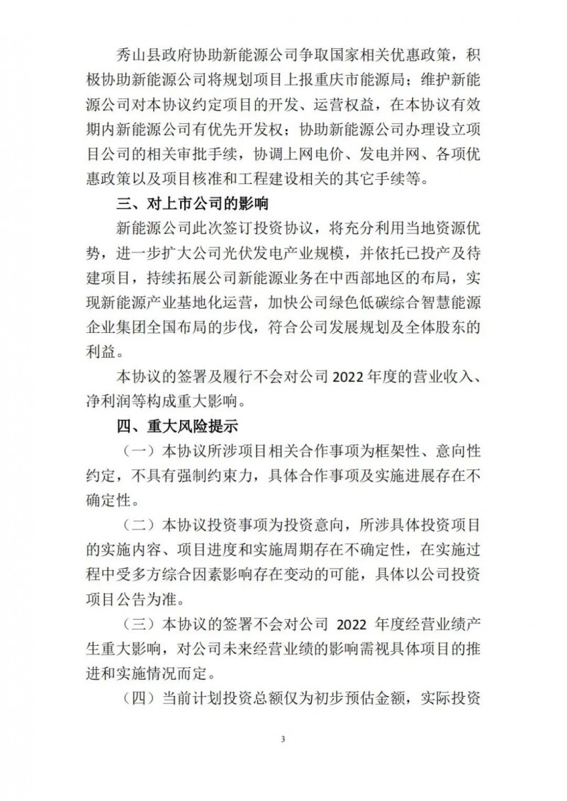 此次簽訂投資協(xié)議,新能源公司將充分利用當?shù)刭Y源優(yōu)勢,進一步擴大公司光伏發(fā)電產(chǎn)業(yè)規(guī)模,并依托已投產(chǎn)及待建項目,持續(xù)拓展公司新能源業(yè)務在中西部地區(qū)的布局,實現(xiàn)新能源產(chǎn)業(yè)基地化運營,加快公司綠色低碳綜合智慧能源企業(yè)集團全國布局的步伐。