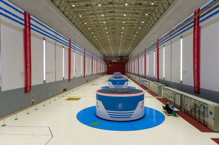 長龍山電站廠房內(nèi)共布置6臺35萬千瓦抽水蓄能機組,根據(jù)電網(wǎng)調(diào)度指令,在用電高峰期發(fā)電調(diào)峰,在用電低谷期抽水填谷,單臺機組每小時可抽水16萬立方米,假如6臺機組同抽,可以在8小時內(nèi)將上水庫從死水位抽至正常蓄水位,相當于為“充電寶”充進超過1260萬度電。假如在用電高峰期6臺機組齊發(fā),長龍山電站可持續(xù)6個小時滿發(fā),每個小時輸出電量210萬千瓦時。