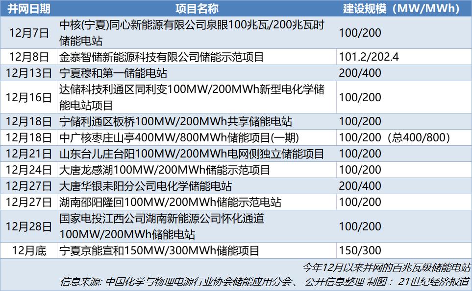 21世紀(jì)經(jīng)濟(jì)報(bào)道記者根據(jù)公開信息不完全統(tǒng)計(jì)發(fā)現(xiàn),截至12月28日,本月已有28個(gè)新型儲(chǔ)能項(xiàng)目完成并網(wǎng)交付。這其中,不乏數(shù)十個(gè)百兆瓦級(jí)容量的大型地面電站、獨(dú)立共享儲(chǔ)能電站順利并網(wǎng),也誕生了多個(gè)地方儲(chǔ)能電站的規(guī)模之最、建設(shè)速度之最。事實(shí)上,這也為明年國(guó)內(nèi)大型儲(chǔ)能電站的推進(jìn)立下了樂觀的預(yù)期。