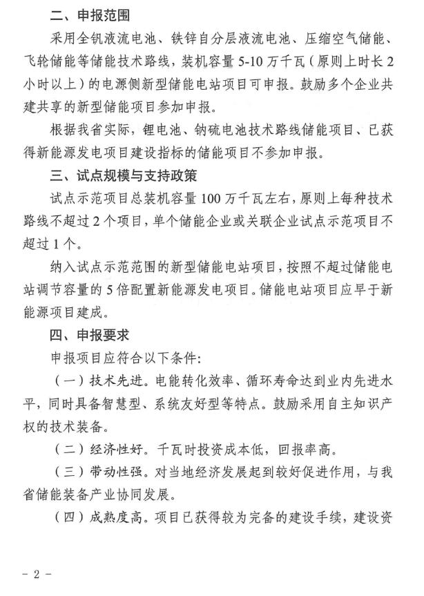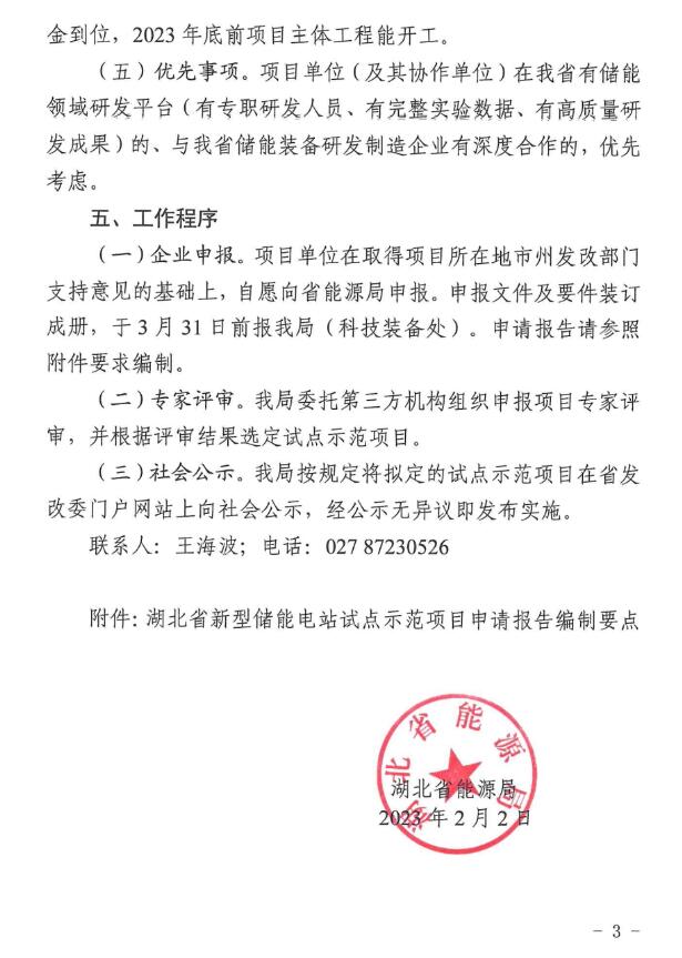 2月3日,湖北省能源局發(fā)布了《省能源局關于開展新型儲能電站試點示范工作的通知》。《通知》表示,本次試點釋放項目總裝機規(guī)模約1GW左右。原則上每種技術路線不超過2個項目;納入試點示范范圍的新型儲能電站項目,按照不超過儲能電池調節(jié)容量的5倍配置新能源發(fā)電項目。儲能電站項目應早于新能源項目建成。申報截止時間3月31日。