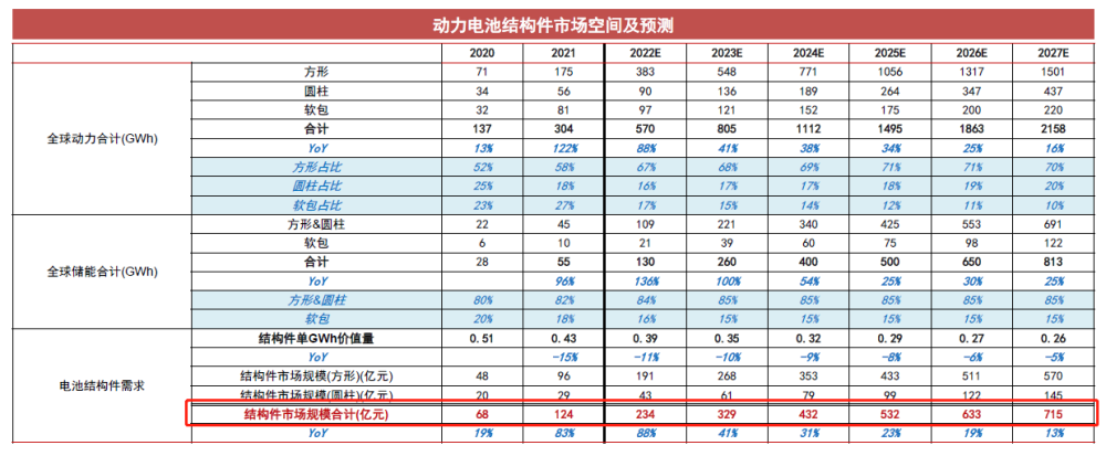 電池結(jié)構(gòu)件位于鋰電池行業(yè)上游,單GWh價(jià)值量與負(fù)極、隔膜電解液相當(dāng)。受益于全球新能源汽車、儲(chǔ)能行業(yè)的高景氣度增長,方形、圓柱電池需求增長,袁健聰預(yù)計(jì)2025年全球電池結(jié)構(gòu)件行業(yè)市場空間約532億元,相比2022年市場空間翻倍,對(duì)應(yīng)2022-2025年CAGR為31%。