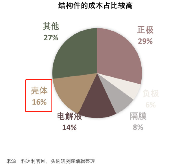 電池結(jié)構(gòu)件主要有圓柱形結(jié)構(gòu)件、方形結(jié)構(gòu)件和鋁塑膜三種類型,分別對(duì)應(yīng)方形電池、圓柱電池、軟包電池。其中,圓柱形結(jié)構(gòu)件和方形結(jié)構(gòu)件又稱為硬殼結(jié)構(gòu)件,由殼體和蓋板組成。在鋰電池成本結(jié)構(gòu)中,結(jié)構(gòu)件成本占比達(dá)16%,僅次于正極。