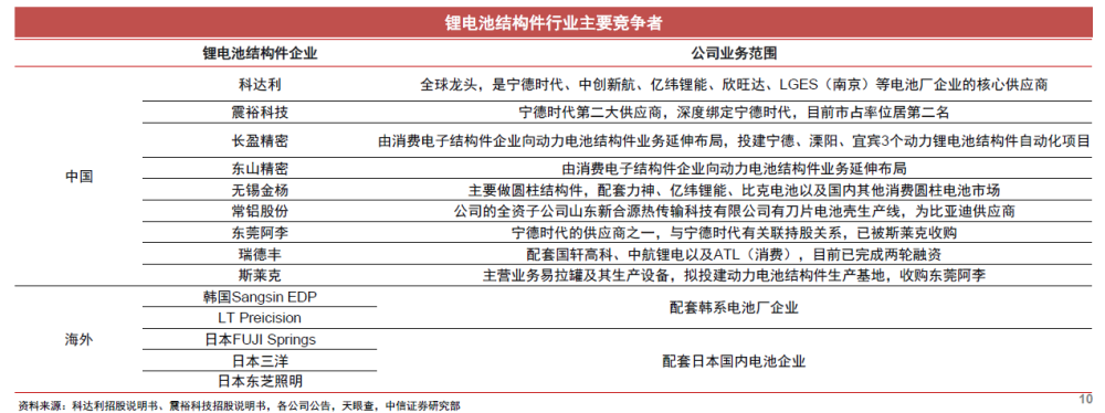 科達(dá)利為行業(yè)龍頭,最早布局動(dòng)力電池結(jié)構(gòu)件業(yè)務(wù),具備技術(shù)、產(chǎn)能規(guī)模優(yōu)勢,是下游大客戶寧德時(shí)代、LGES、中創(chuàng)新航等主流電池廠的核心供應(yīng)商。行業(yè)龍二為震裕科技,是寧德時(shí)代的另一大核心供應(yīng)商。此外還有長盈精密、東山精密、無錫金楊、常鋁股份、東莞阿李、瑞德豐、斯萊克等競爭者(如圖)。