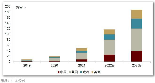 據(jù)中金公司預(yù)測,今年全球儲(chǔ)能需求有望達(dá)189GWh,同比增長超60%。美國、中國、歐盟成為全球三大儲(chǔ)能市場。
