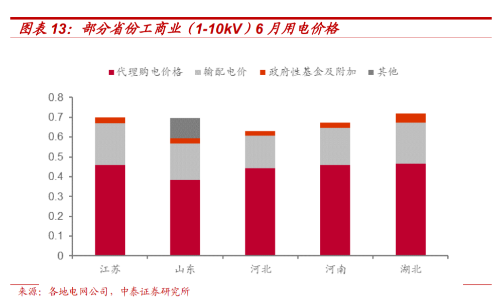 此前,關(guān)于儲能充電是否需承擔(dān)輸配電價等費用,各地沒有明確統(tǒng)一的標(biāo)準(zhǔn)。《通知》特別指出,獨立儲能電站向電網(wǎng)送電的,其相應(yīng)充電電量不承擔(dān)輸配電價和政府性基金及附加,這一規(guī)定將大幅降低儲能充電成本。我們統(tǒng)計了部分省份2022年6月代理購電的用電價格,輸配電價和政府性基金及附加合計占用電價格的比例超過30%,以江蘇省為例,代理購電價格、輸配電價、政府性基金及附加分別為0.4594、0.2110、0.0294 元/kWh,輸配電價及政府性基金占用電價格比例為 34.35%。若儲能充電需支付這兩部分費用,將大幅提高充電成本,因此這一規(guī)定將明確儲能項目邊界條件,保障儲能合理收益,提高儲能投資意愿。
