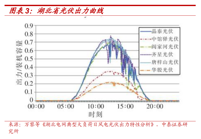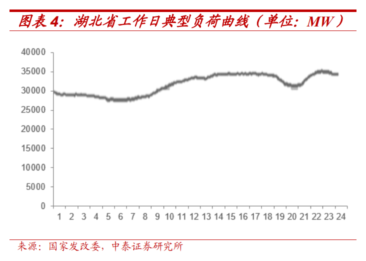 是一天中的最低位。光伏出力曲線和負荷曲線相對更適配,白天為曲線高位,但以湖北省為例,20時至23時負荷仍處于相對高位,而此時光伏出力為0。因此當(dāng)新能源發(fā)電量占比達到一定程度,電源和負荷的曲線差異將對電網(wǎng)的運行效率和安全造成沖擊,或?qū)е麓罅織夛L(fēng)棄光現(xiàn)象。