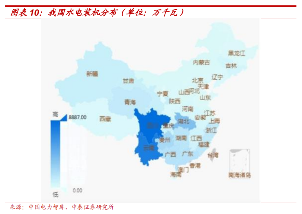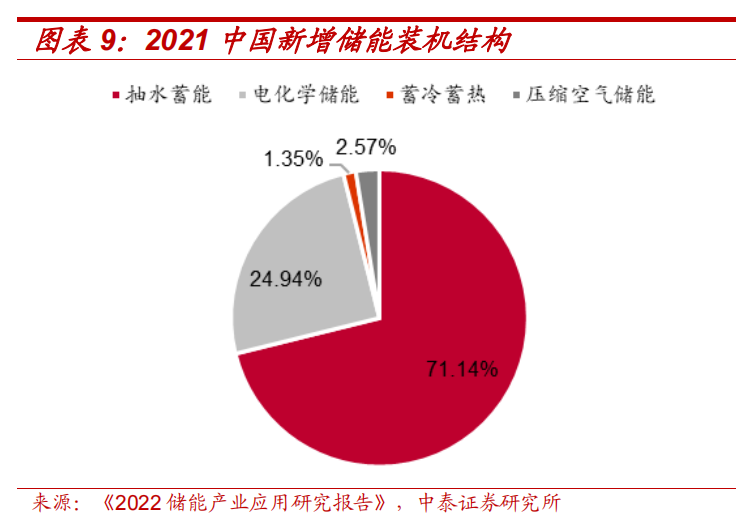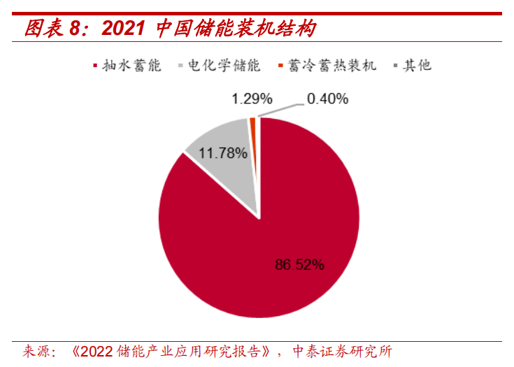 2021年中國抽水蓄能裝機功率38GW,占比全部儲能的86.52%,電化學(xué)儲能裝機功率5GW,占比11.78%,抽水蓄能是我國存量儲能的主要形式。2021年中國新增抽水蓄能裝機5GW,占比71.14%,電化學(xué)儲能新增2GW,占比24.94%,電化學(xué)儲能裝機增速超過抽水蓄能。抽水蓄能需要尋找合適地形及水域,同時可能涉及搬遷移民問題,外部限制因素較多,建設(shè)期通常長達數(shù)年。我國水電資源主要集中在南方地區(qū)尤其是西南地區(qū),西北等地區(qū)缺發(fā)建設(shè)大型抽蓄配套新能源的條件。而電化學(xué)儲能則對外界條件要求不高,建設(shè)期較短,單體投資小,因而成為新能源配儲的普遍選擇。