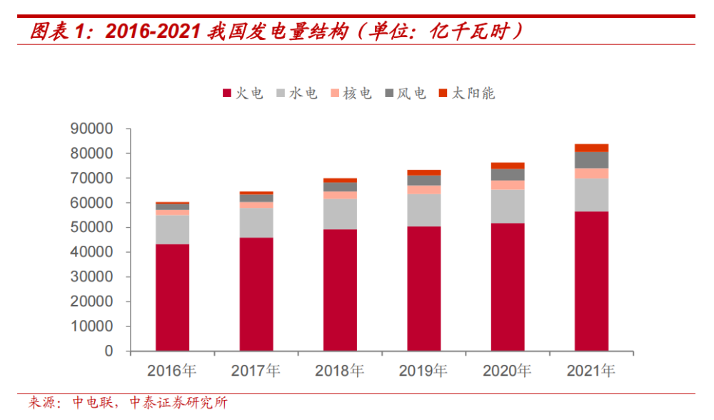 截至2021年,我國風(fēng)電裝機規(guī)模328.48GW,光伏裝機規(guī)模 306.56GW。2021年風(fēng)電發(fā)電量為6556億千瓦時,占比7.83%,太陽能發(fā)電量3270億千瓦時,占比3.91%,發(fā)電量合計占比 11.74%,較2016年的5.10%提升6.64pct。
