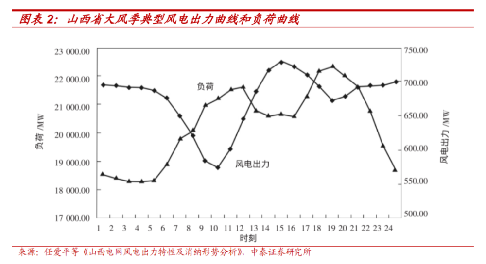 根據(jù)山西省大風(fēng)季典型風(fēng)電出力曲線和負荷曲線可見,風(fēng)電出力和負荷二者具有較大差異,風(fēng)電在21時至次日5時出力處于相對高位,而此時用電負荷卻