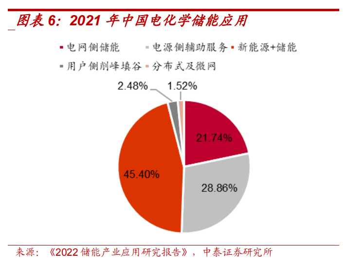 2021年起,各省密集發(fā)布新能源項目配套儲能政策,配臵比例主要在 10%-20%區(qū)間,配臵時長1-2小時,推動我國電化學(xué)儲能高速增長。根據(jù)《2022儲能產(chǎn)業(yè)研究報告》,2021年我國新能源配儲占電化學(xué)儲能應(yīng)用的45.40%,我國電化學(xué)儲能主要應(yīng)用在電源側(cè)和電網(wǎng)側(cè)來支持風(fēng)光新能源消納和新型電力系統(tǒng)建設(shè)。