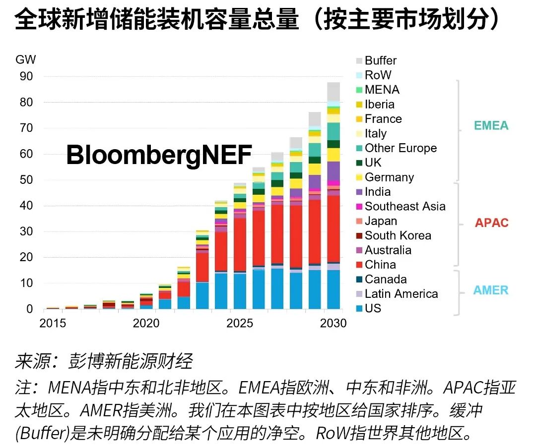 按GW計(jì),到2030年美洲地區(qū)將占到年度儲(chǔ)能裝機(jī)容量的21%。受加州、西南部和德克薩斯州的一系列大型項(xiàng)目帶動(dòng),美國是迄今為止最大的市場(chǎng)。由于電池成本上升,美國出現(xiàn)了一波項(xiàng)目延遲。盡管如此,美國公用事業(yè)公司繼續(xù)采購與光伏配套的儲(chǔ)能,以提高系統(tǒng)可靠性。與此同時(shí),一些長(zhǎng)時(shí)儲(chǔ)能項(xiàng)目獲得發(fā)展動(dòng)力。智利市場(chǎng)改革可能為拉丁美洲新興儲(chǔ)能市場(chǎng)新增裝機(jī)容量加速鋪平道路。智利和巴西各地光伏和風(fēng)電裝機(jī)容量迅速增長(zhǎng),墨西哥電網(wǎng)投資不足,這可能為儲(chǔ)能提供機(jī)會(huì)。