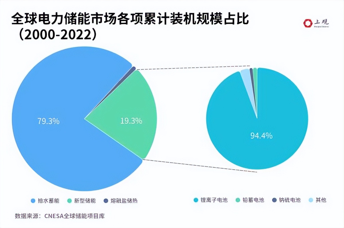 傳統(tǒng)儲能產(chǎn)業(yè)大多利用水勢高低差進(jìn)行抽水蓄能,這也是目前全球儲能的主要方式,占比近八成。但抽水蓄能受地理資源約束明顯,一般只能建造在山區(qū)與丘陵地帶,且建造成本高、時間長。隨著新能源產(chǎn)業(yè)的不斷發(fā)展,以鋰電池儲能為代表的新型儲能產(chǎn)品技術(shù)逐漸成熟、成本下降,迎來了大規(guī)模商業(yè)化的時機(jī)。