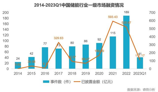 近些年國內(nèi)一級(jí)市場(chǎng)投融資整體呈現(xiàn)持續(xù)下滑趨勢(shì),但儲(chǔ)能行業(yè)投融資熱度持續(xù)高漲。根據(jù)睿獸分析統(tǒng)計(jì),截至2023年3月31日,國內(nèi)儲(chǔ)能行業(yè)有300余家企業(yè)獲得融資,涉及融資事件944件、融資金額1947億元,參與機(jī)構(gòu)達(dá)1122家。中國儲(chǔ)能行業(yè)在2021年、2022年迎來爆發(fā),2022年中國儲(chǔ)能行業(yè)融資事件189件,同比增長64.3%,融資金額520.97億元,同比下降12.2%,但仍處于高位。近10年,中國儲(chǔ)能行業(yè)累計(jì)獲得超1900億元融資。