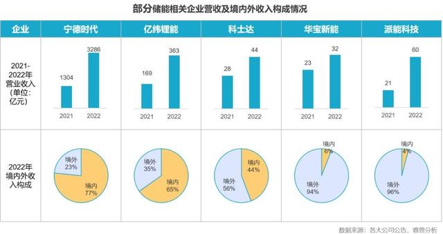 2022年是儲(chǔ)能出海元年,之前海外儲(chǔ)能市場(chǎng)一直被日韓品牌占據(jù),隨著海外儲(chǔ)能市場(chǎng)需求火爆,國內(nèi)儲(chǔ)能企業(yè)紛紛出海,目前海外儲(chǔ)能市場(chǎng)已經(jīng)成為國內(nèi)儲(chǔ)能企業(yè)創(chuàng)收貢獻(xiàn)最大的市場(chǎng)。根據(jù)已發(fā)布2022年度報(bào)告的儲(chǔ)能上市企業(yè)數(shù)據(jù),多數(shù)儲(chǔ)能相關(guān)企業(yè)營收獲得兩位數(shù)以上增長,其中寧德時(shí)代、億緯鋰能、派能科技等企業(yè)營收增長超過100%;企業(yè)海外市場(chǎng)營收增速較快,部分企業(yè)海外市場(chǎng)營收占比超過90%,華寶新能、派能科技境外營收比重分別達(dá)到94%和96%。