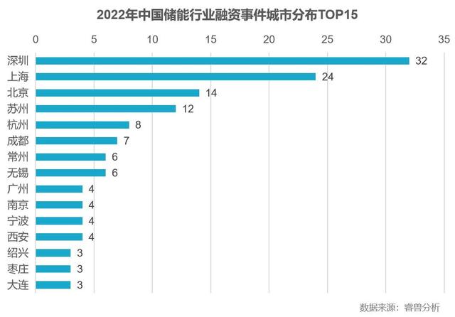 根據(jù)睿獸分析統(tǒng)計(jì),2022年中國儲(chǔ)能行業(yè)融資事件遍布全國20余個(gè)省份,其中廣東、江蘇、上海三地領(lǐng)先,三省融資事件數(shù)量合計(jì)占比50.53%。從城市分布來看,深圳、上海、北京、蘇州、杭州位居全國前五位,合計(jì)占比達(dá)47.87%。