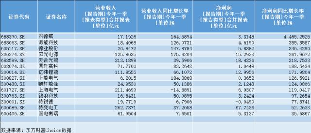 下游應(yīng)用端需求的大幅提升,也使得儲能行業(yè)公司迎來了業(yè)績爆發(fā)。從一季報(bào)表現(xiàn)來看,證券之星篩選了表現(xiàn)出眾的一些上市公司。如下圖所示: