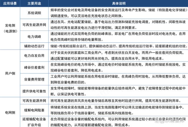 發(fā)電側(cè)可用于系統(tǒng)調(diào)頻、可再生能源并網(wǎng)、電力調(diào)峰、輔助動(dòng)態(tài)運(yùn)行等;在用戶側(cè)主要用于電力自發(fā)自用、峰谷價(jià)差套利、容量電費(fèi)管理和提升供電可靠性等;在電網(wǎng)側(cè)主要用于可再生能源并網(wǎng)、緩解電網(wǎng)阻塞、延緩輸配電設(shè)備擴(kuò)容升級(jí)等。
