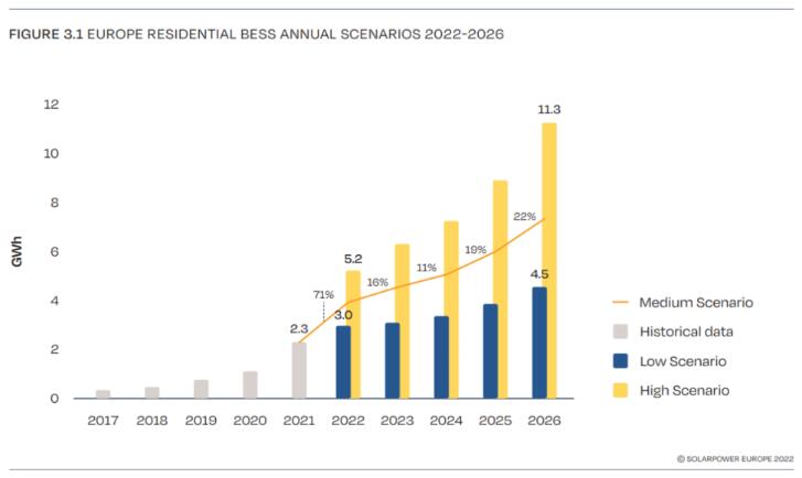歐洲光伏產(chǎn)業(yè)協(xié)會《歐洲戶用儲能市場展望報告 2022-2026》裝機量預(yù)測