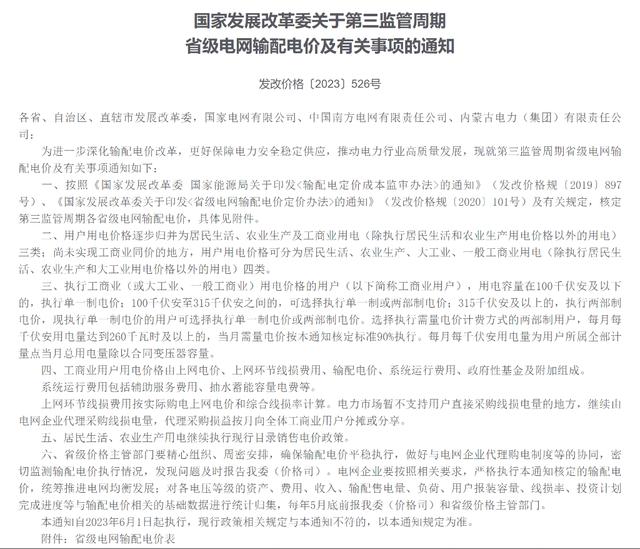 5月15日,國家發(fā)改委官網(wǎng)發(fā)布《關(guān)于第三監(jiān)管周期省級電網(wǎng)輸配電價(jià)及有關(guān)事項(xiàng)的通知》(發(fā)改價(jià)格〔2023〕526號(hào))、《關(guān)于第三監(jiān)管周期區(qū)域電網(wǎng)輸電價(jià)格及有關(guān)事項(xiàng)的通知》(發(fā)改價(jià)格〔2023〕532號(hào))關(guān)于輸配電價(jià)的重要文件。本次文件在2015年電力市場化改革后可以視為里程碑式的文件。