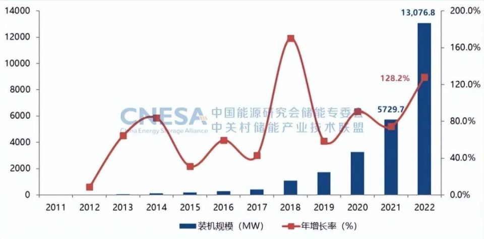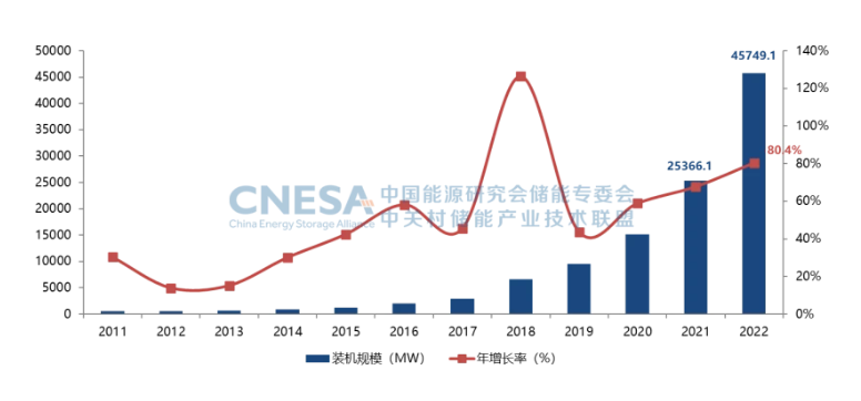 根據(jù)CNESA全球儲能項目庫的不完全統(tǒng)計,截至2022年底,中國已投運電力儲能項目累計裝機規(guī)模59.8GW,占全球市場總規(guī)模的25%,年增長率38%。抽水蓄能累計裝機占比同樣首次低于80%,與2021年同期相比下降8.3個百分點;新型儲能繼續(xù)高速發(fā)展,累計裝機規(guī)模首次突破10GW,達到13.1GW/27.1GWh,功率規(guī)模年增長率達128%,能量規(guī)模年增長率達141%。