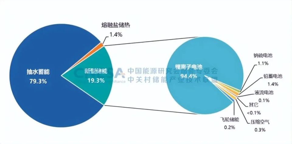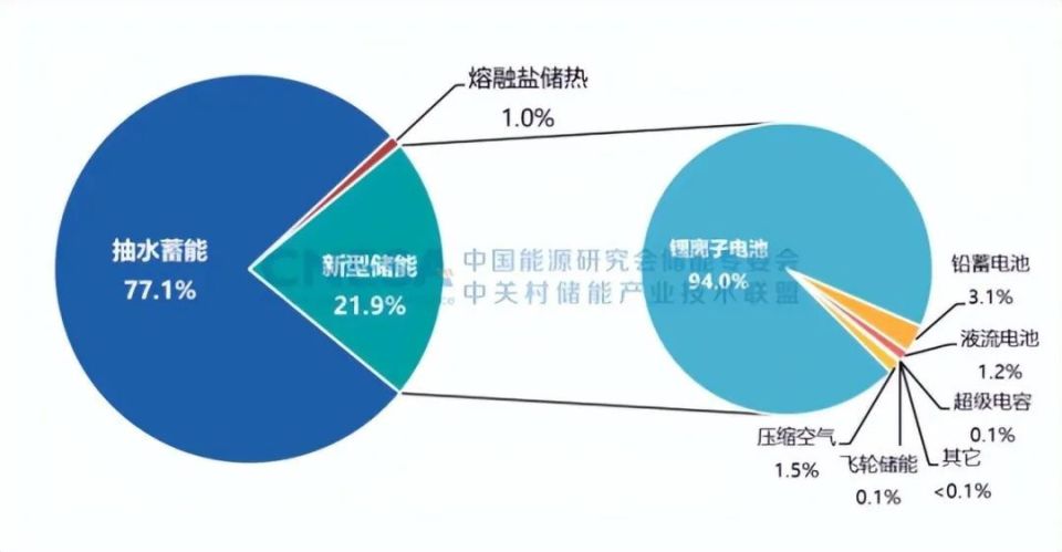 2022年,中國新增投運電力儲能項目裝機規(guī)模首次突破15GW,達到16.5GW,其中,抽水蓄能新增規(guī)模9.1GW,同比增長75%;新型儲能新增規(guī)模創(chuàng)歷史新高,達到7.3GW/15.9GWh,功率規(guī)模同比增長200%,能量規(guī)模同比增長280%;新型儲能中,鋰離子電池占據(jù)絕對主導(dǎo)地位,比重達97%,此外,壓縮空氣儲能、液流電池、鈉離子電池、飛輪等其它技術(shù)路線的項目,在規(guī)模上有所突破,應(yīng)用模式逐漸增多。