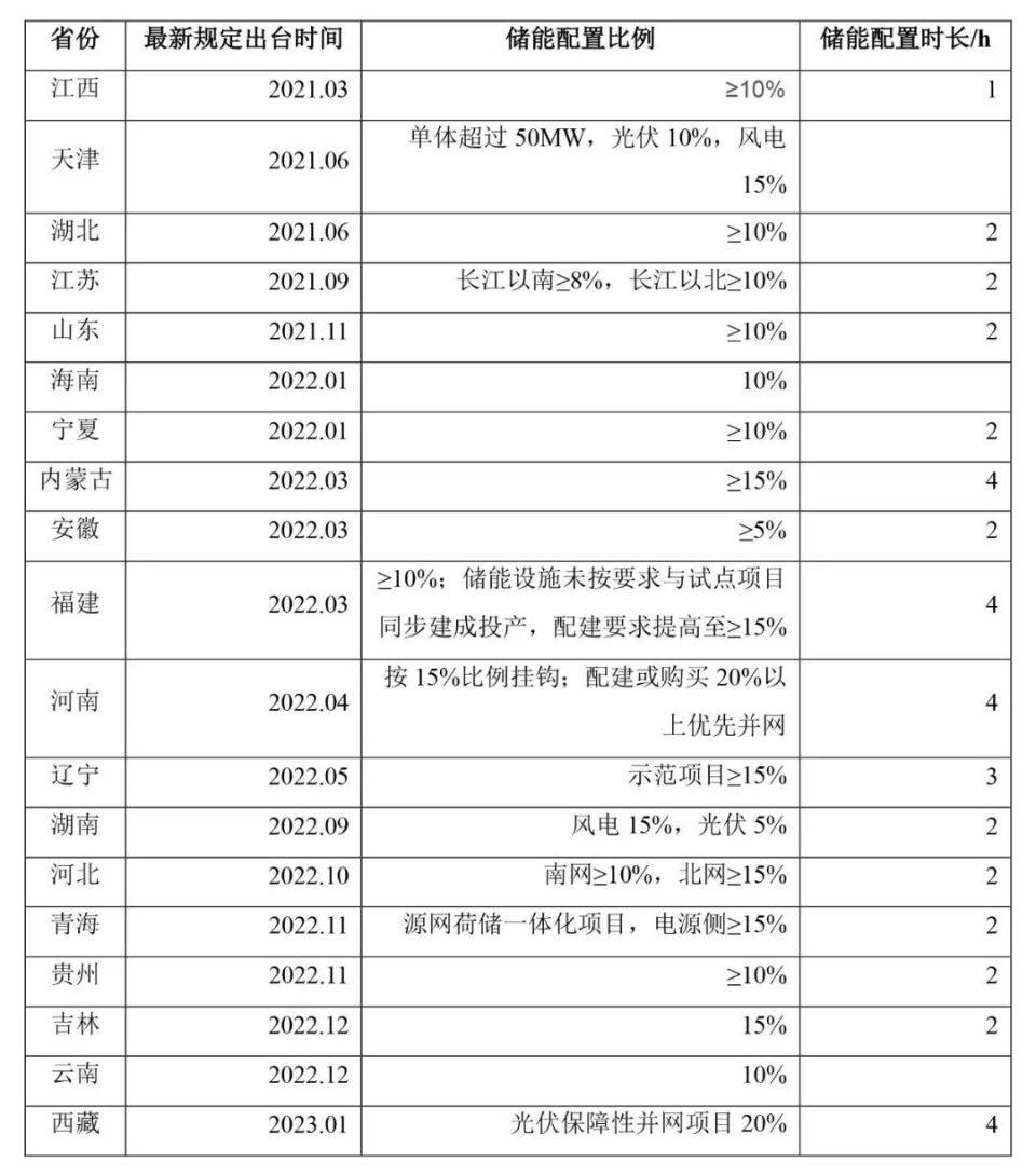 為響應(yīng)上述國家政策的號召,在地方層面,已有多地有關(guān)部門因地制宜地推出了新能源項目(主要為風(fēng)電、光伏電站)的強制配儲政策,部分列示如下: