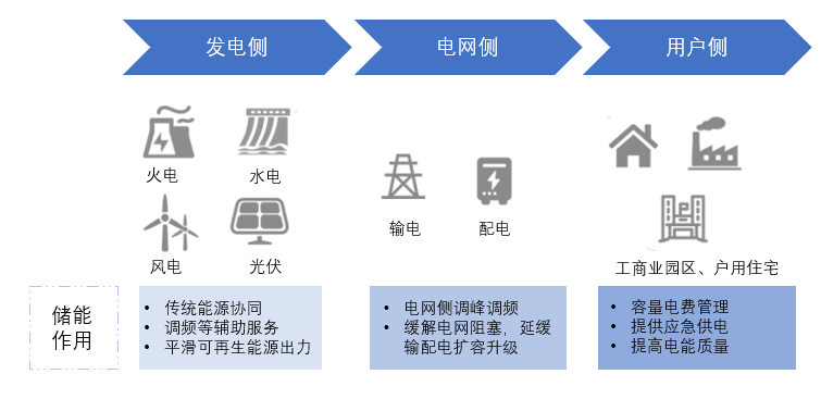 從整個電力系統(tǒng)的角度看,儲能的應(yīng)用場景可分為發(fā)電側(cè)儲能、電網(wǎng)側(cè)儲能和用戶側(cè)儲能三大場景。其中,發(fā)電側(cè)對儲能的需求場景類型較多,包括可再生能源并網(wǎng)、電力調(diào)峰、系統(tǒng)調(diào)頻等;電網(wǎng)側(cè)儲能主要發(fā)揮支撐電力保供、提升系統(tǒng)調(diào)節(jié)能力、支撐新能源高比例外送以及替代輸配電工程投資等作用;用戶側(cè)儲能主要用于電力自發(fā)自用、峰谷價差套利、容量電費管理和提高供電可靠性等。然而,在實際應(yīng)用中,儲能的某一功能應(yīng)用并不局限于單一應(yīng)用場景,以平滑輸出、跟蹤出力計劃為例,可同時應(yīng)用于發(fā)電側(cè)、電網(wǎng)側(cè)和用戶側(cè)。
