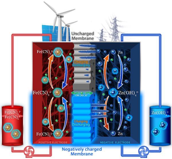 鋅鐵液流電池選用礦藏儲量豐富且價格穩(wěn)定的鋅、鐵元素組成配對,依靠鋅酸鹽離子和鐵離子之間的電化學(xué)反應(yīng)來實(shí)現(xiàn)電能的儲存和釋放,采用堿性電解液,擁有零爆炸零燃燒的特性,電池放電次數(shù)超過20000次,使用壽命超過20年,在額定功率輸出下,放電時長超過8小時。