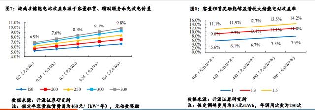 并且在容量租賃獎(jiǎng)勵(lì)為1.3倍和1.5倍時(shí),其資本金收益率能夠放大至11.1%與13.5%??紤]到當(dāng)前湖南省仍存在較大的電 網(wǎng)側(cè)儲能裝機(jī)缺口,調(diào)峰服務(wù)輔助頻次和價(jià)格均有望實(shí)現(xiàn)較大的提升,在不考慮容量租賃獎(jiǎng)勵(lì)的情況下,其資本金收益在年調(diào)用次 數(shù)為330次,調(diào)峰輔助服務(wù)收益為0.4元/kWh的情況下,其資本金收益率能夠達(dá)到9.8%。隨著電力輔助服務(wù)種類增多和電力現(xiàn)貨市場 的開展,其收益方式有望進(jìn)一步增加。同時(shí)儲能電站的收益在一定程度上依賴電站運(yùn)營商自身的運(yùn)營水平,隨著儲能電站運(yùn)營商的 經(jīng)驗(yàn)積累,收益能力有望進(jìn)一步提升。
