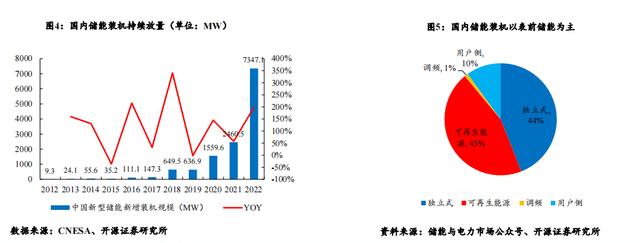 國內(nèi)儲能裝機(jī)有望持續(xù)增長,表前儲能為裝機(jī)主力。根據(jù)CNESA數(shù)據(jù)統(tǒng)計(jì),2012-2022年間國內(nèi)新型儲能新增裝機(jī)復(fù)合增 速高達(dá)95%。2022年國內(nèi)新型儲能新增裝機(jī)高達(dá)7.3GW,同比增長近200%。就國內(nèi)儲能裝機(jī)類型分布而言,根據(jù)儲能與 電力市場公眾號統(tǒng)計(jì),可再生能源配儲與獨(dú)立儲能裝機(jī)占比分別為45%與44%,用于調(diào)頻的裝機(jī)占比僅為1%,工商業(yè)用 戶側(cè)儲能裝機(jī)占比10%。我國當(dāng)前的儲能類型主要還是以用于配套新能源裝機(jī)的表前儲能裝機(jī)為主。