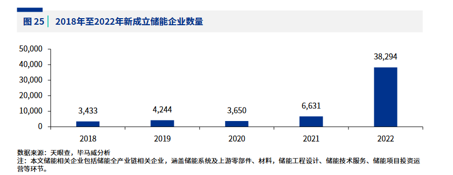 最近,特斯拉儲(chǔ)能超級(jí)工廠落戶上海、知名酒企五糧液擬跨界儲(chǔ)能,小米、華為等企業(yè)均增設(shè)部門聚焦,儲(chǔ)能賽道可謂是炙手可熱,無(wú)論是在制造環(huán)節(jié),還是在終端應(yīng)用市場(chǎng),數(shù)萬(wàn)家企業(yè)正搶占布局。據(jù)畢馬威中國(guó)與中國(guó)電力企業(yè)聯(lián)合會(huì)聯(lián)合發(fā)布的《新型儲(chǔ)能助力能源轉(zhuǎn)型》顯示,2021年之前,我國(guó)每年新成立的儲(chǔ)能相關(guān)企業(yè)大約在三四千家。隨著儲(chǔ)能行業(yè)的迅速升溫,2022年成立了38294家儲(chǔ)能相關(guān)企業(yè),是2020年新成立儲(chǔ)能企業(yè)數(shù)量的10倍,是2021年的近6倍。