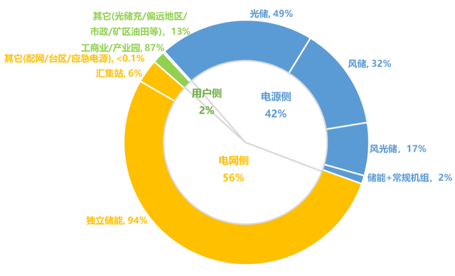 中國新增投運新型儲能項目應(yīng)用裝機分布(2023年1-6月份,MW%)