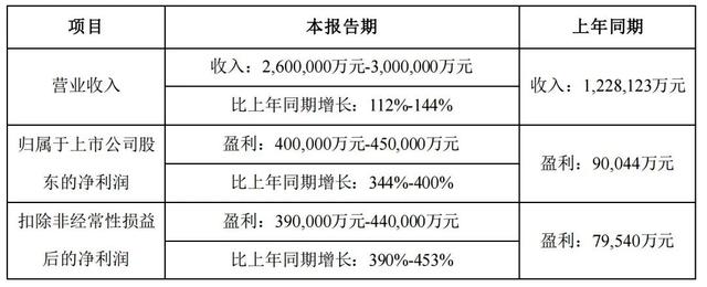 此外,最受關(guān)注的是其凈利潤(rùn)的數(shù)據(jù),預(yù)計(jì)實(shí)現(xiàn)40-45億,同比增長(zhǎng)344%-400%,而扣非凈利增幅更甚,同增更是高達(dá)390%-453%。