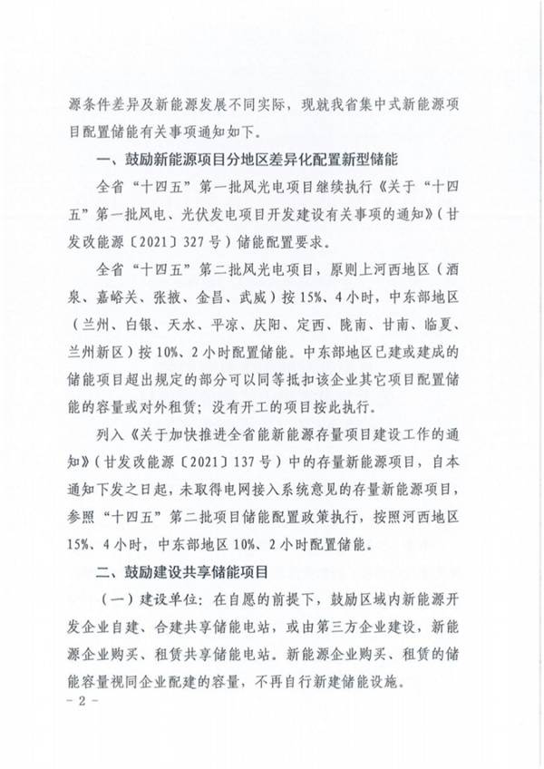 “十四五”第二批風(fēng)光電項目:河西地區(qū)(酒泉、嘉峪關(guān)、張掖、金昌、武威)配置儲能為15%,連續(xù)時長4小時;中東部地區(qū)(蘭州、白銀、天水、平?jīng)觥c陽、定西、隴南、甘南、臨夏、蘭州新區(qū))配置儲能為10%,連續(xù)時長2小時。