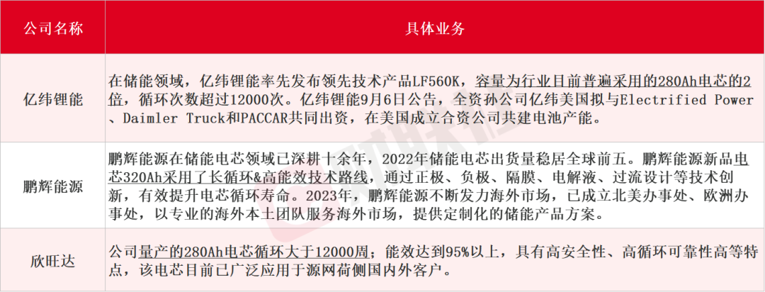 據(jù)財聯(lián)社不完全整理,出口海外的儲能電芯A股上市公司主要為億緯鋰能、鵬輝能源、欣旺達等,還包括自研電芯配套戶儲終端產(chǎn)品的企業(yè),如比亞迪、派能科技等。而另一邊,儲能電池出海的風吹向了大儲,截至目前,已經(jīng)有包括瑞浦蘭鈞、遠景動力、海辰儲能、億緯鋰能等多家企業(yè)獲海外儲能集成商大單,單筆最大訂單已達10GWh。A股上市公司具體業(yè)務如下: