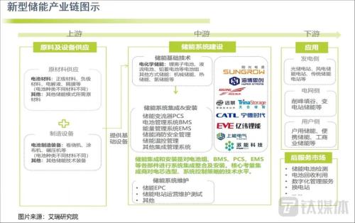 根據(jù)艾瑞研究院的梳理,儲能產(chǎn)業(yè)鏈的上游主要是電池材料的原材料供應商和制造商;中游則是系統(tǒng)建設環(huán)節(jié),包括基礎技術(shù)、系統(tǒng)集成安裝和系統(tǒng)運維三大部分,市場中最知名的寧德時代、億鋰緯能、陽光電源、天合光能等都處于中游;下游則是發(fā)電側(cè)、電網(wǎng)側(cè)、用戶側(cè)的應用及服務。