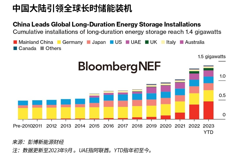 LDES部署在2022年加速,主要受到中國的推動。然而,部署規(guī)模仍然很小。截至2023年9月,我們追蹤到全球已投運LDES裝機容量約為1.4GW/8.2GWh,不到鋰離子電池裝機量的3%。
