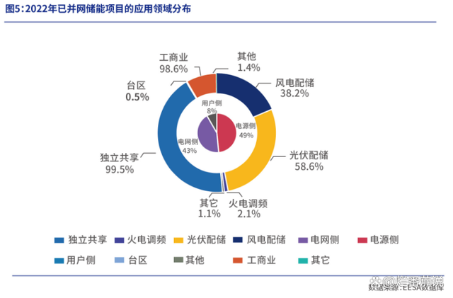 儲能下游的應用場景可分為電源側(又稱發(fā)電側)、電網(wǎng)側和用戶側。據(jù)《2023年中國新型儲能產(chǎn)業(yè)發(fā)展白皮書》統(tǒng)計,從2022年已并網(wǎng)儲能項目應用領域來看,電源側、電網(wǎng)側、用戶側項目分布比例分別是49%、43%和8%。具體來看,光伏配儲和風光配儲又分別占電源側項目的58.6%和38.2%,也就是配儲合計占電源側項目的96.8%。