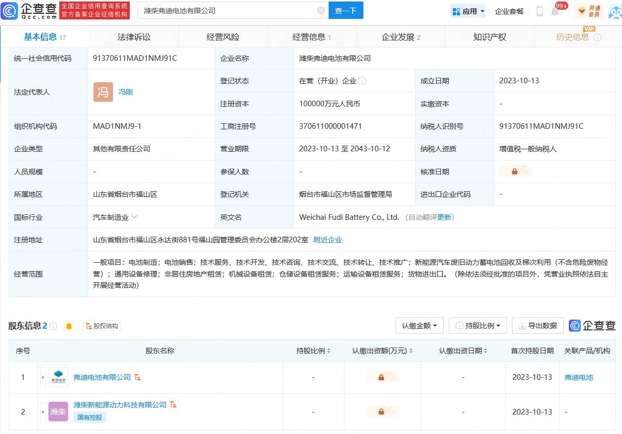 近日,濰柴弗迪電池有限公司成立,法定代表人為馮剛,注冊資本10億,經(jīng)營范圍含電池制造,電池銷售,技術(shù)服務(wù)、技術(shù)開發(fā)、技術(shù)咨詢、技術(shù)交流、技術(shù)轉(zhuǎn)讓、技術(shù)推廣,新能源汽車廢舊動(dòng)力蓄電池回收及梯次利用等。