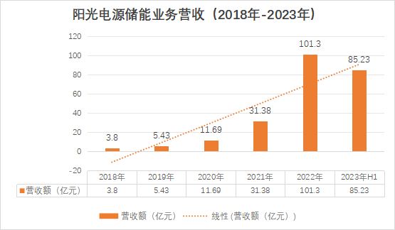 除了出貨量之外,業(yè)績,也是一面鏡子,它是公司過往戰(zhàn)略的倒影。儲能營收的飛速增長,無疑也印證了陽光電源儲能布局和戰(zhàn)略定位的成功。2023年4月25日,陽光電源披露2022年年度報告,其儲能系統(tǒng)營收實現(xiàn)101.26億,首次破百億。2023年半年報顯示,僅半年其儲能營收已經高達85.23億。
