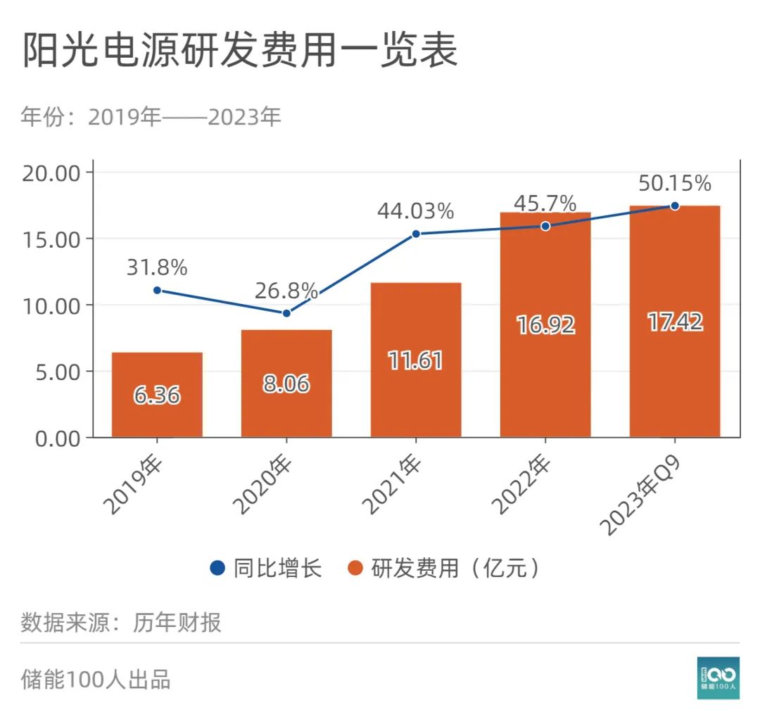 事實上,陽光電源自1997年成立起,26年來一直不斷加大科研投入,時刻不忘技術創(chuàng)新。截至目前,其在合肥、上海、南京、深圳、德國、荷蘭有六大研發(fā)中心,研發(fā)人員占比40%,2023年前三季度研發(fā)費用投入17.42億元。申請專利5300余項,持有數(shù)業(yè)內第一。