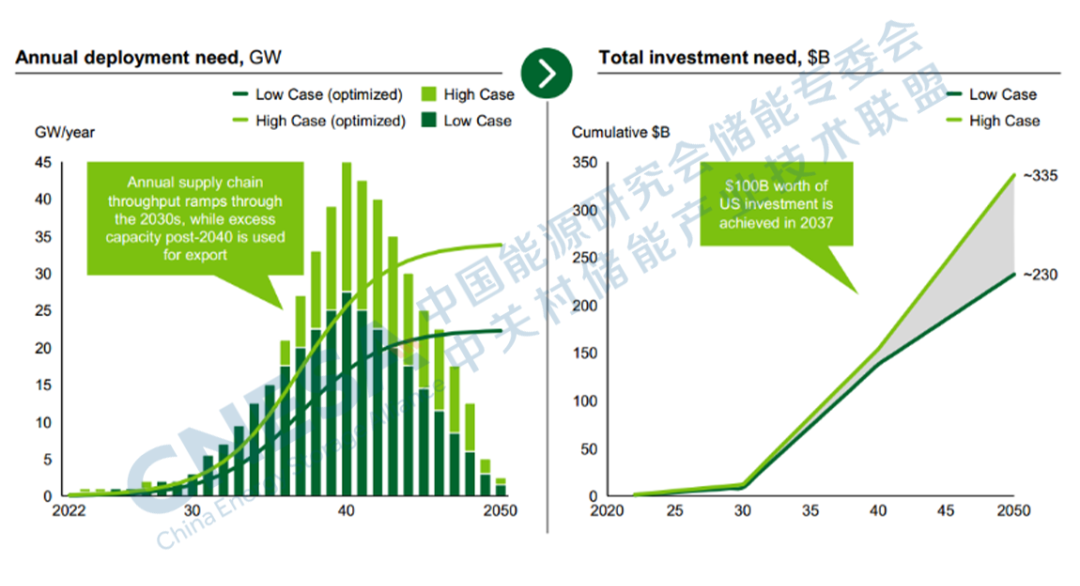 備注:圖中PUC代表公共事業(yè)委員會,RA代表資源充足。起飛點(diǎn)被定義為LDES行業(yè)成為一個很大程度上自我維持的市場;在鋰離子電池競爭的情況下,仍然需要多日/周的LDES技術(shù),而積極的鋰離子電池將減少供應(yīng)鏈建設(shè)的需求。