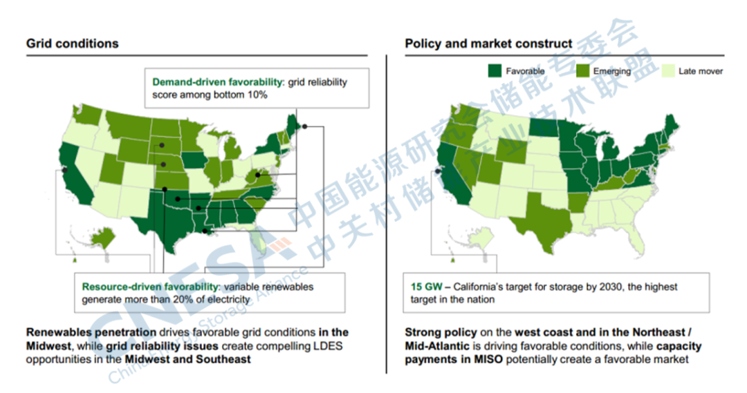 在美國由于不同的電網(wǎng)條件、政策和市場結(jié)構(gòu),LDES部署的就緒程度各不相同。報(bào)告指出:有兩個因素可以用來評估市場LDES的就緒程度:電網(wǎng)條件、政策和市場結(jié)構(gòu)。一是電網(wǎng)條件。衡量LDES在特定狀態(tài)下的可獲得性和相對可行性,以及整體發(fā)電組合。影響因素包括間歇性可再生能源的滲透率百分比、輸配電投資缺口、SAIDI/SAIFI得分衡量的電網(wǎng)彈性以及互聯(lián)的難易程度。二是政策和市場結(jié)構(gòu)。衡量地方政策和收入結(jié)構(gòu)對在該州部署具有有利風(fēng)險(xiǎn)調(diào)整回報(bào)預(yù)期的LDES的有利程度。影響因素包括可再生能源投資組合標(biāo)準(zhǔn)(RPSs)、是否有容量支付以及支付的水平等。通過評估,可以得出加利福尼亞、德克薩斯、紐約、緬因州、愛荷華州和康涅狄格州在近期內(nèi)具有很高的潛力(圖8)。