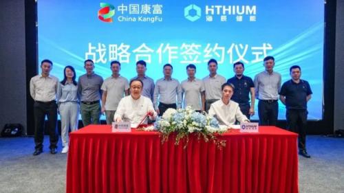 簽約儀式上,海辰儲(chǔ)能副總裁吳玉源,中國康富總裁李建華出席并共同見證簽約;海辰儲(chǔ)能副總經(jīng)理游鍵勇與中國康富副總裁吳民分別代表雙方簽約。