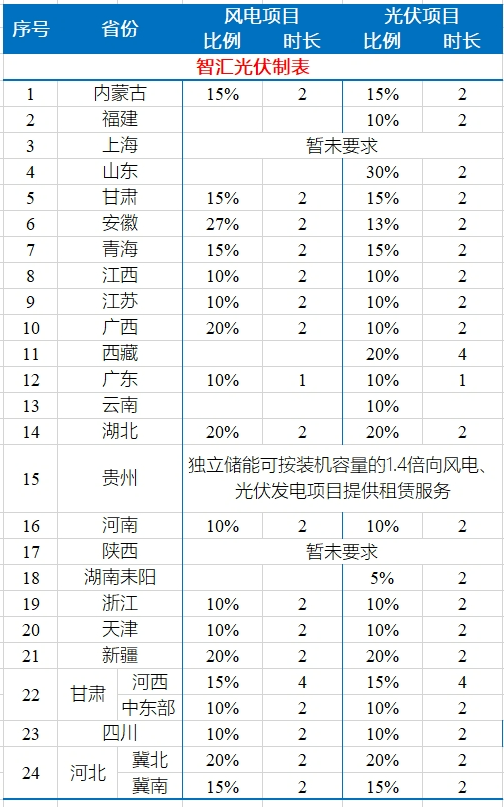 今年以來,全國各省陸續(xù)要求集中式新能源項(xiàng)目配儲。本文統(tǒng)計(jì)了24省/地區(qū)的配儲最低比例,如下表所示。